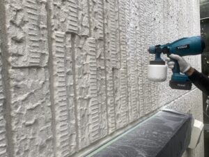 今回、外壁の凹凸が大きく、ローラーと刷毛塗りができないため吹付塗装を行っています。