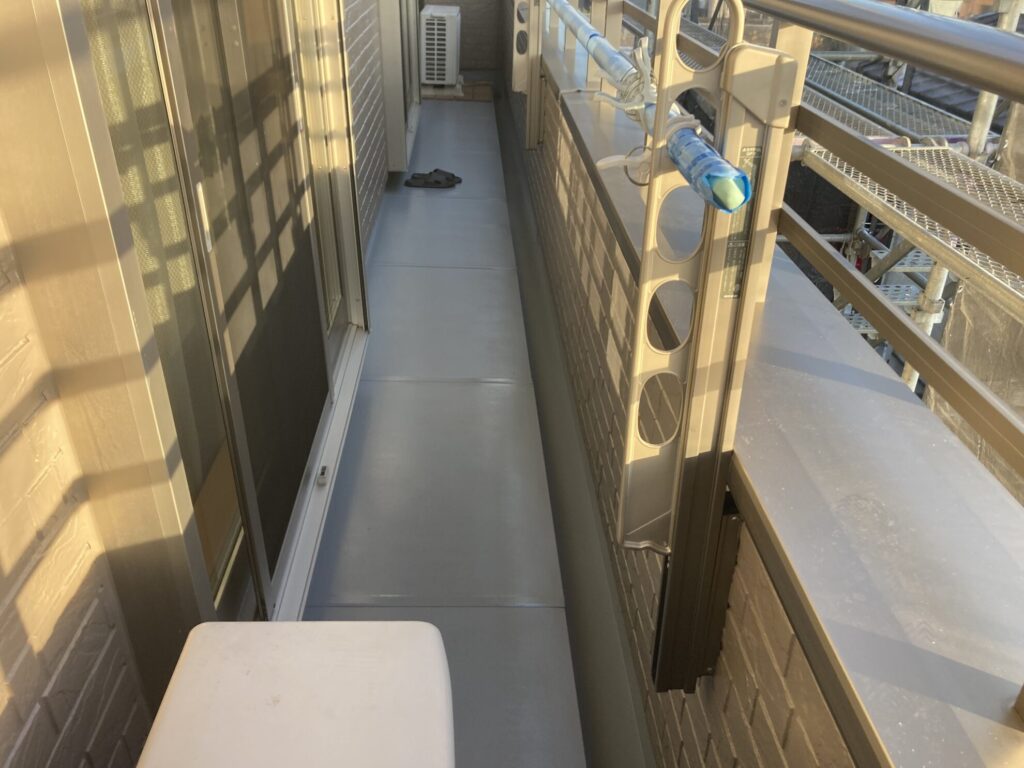 その後、専用の防水トップコートをローラーで丁寧に塗り広げていきます。ムラが出ないよう均一に塗装することで、防水層をしっかりと保護することができます。塗装後は表面がきれいに整い、ベランダ全体が明るく清潔感のある仕上がりになりました✨
